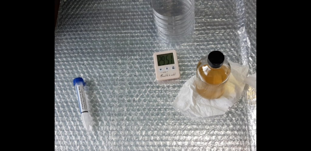 I changed my method of microwaving the Agar solution this time by instead of just stopping the microwaving and waiting for 1~2 seconds, I stopped the microwave, took the bottle out and shook the bottle in circular motions(GENTLY) so that the clear solution wouldn’t evaporate as much from leaving the bottle in the microwave for another minute, and also so that the powder would actually dissolve.