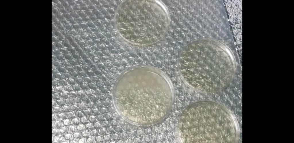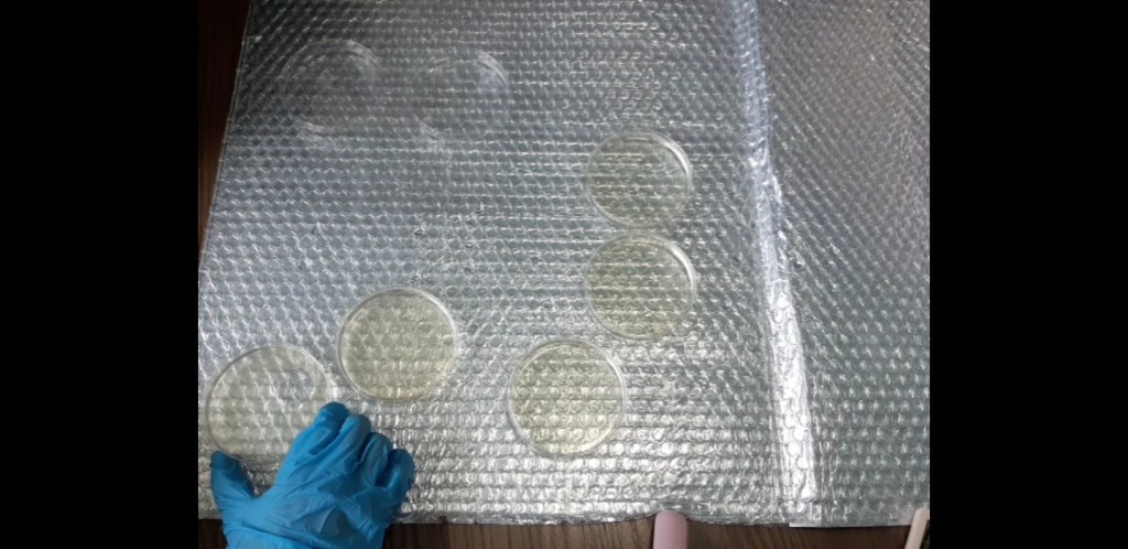 제가, 아가 액체들을 다 페트리 접시에 부은 다음, 모든 페트리 접시들을 거꾸로 뒤집었어요. (뚜껑이 땅에 있게끔) 거꾸로 뒤집었던 이유가 따뜻한 아가 액체를 페트리 접시에 붓고 바로 뚜껑을 껴서 뜨거운 액체에서 나오는 온갖 김과 응축이 모이면서 김에서 생긴 물방울이 굳은 아가겔에 안 떨어지게끔 할려고 했어요.
