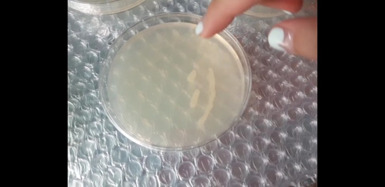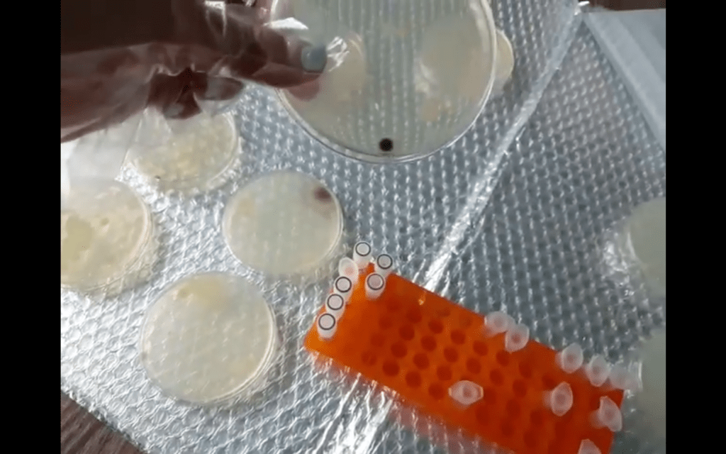 실험 맨 처음에 LB Agar접시에 키운 박테리아가 엄청! 많이 자랐어요. 특히, bacterial tranformation mix 액체 만들려고 긁었던 페트리 접시에 들어있던 박테리아가 엄청 많이 자랐어요! 아마도 멸균루프로 긁으면서 루프에 묻어있는 박테리아가 오염되지 않은 부분에 묻으면서 자란 것 같아요.