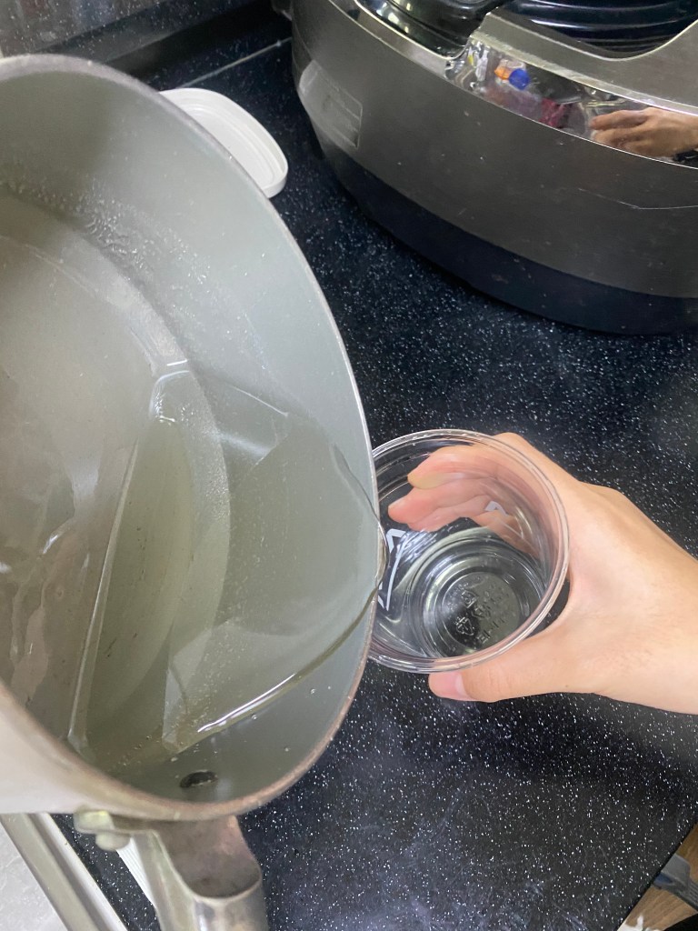 I first tried it out with the brown sugar left at home, with a ratio of sugar to water of 3:1. I boiled the water first in the pot in mid-heat, until the water started bubbling. Then I added in the sugar slowly, cup by cup, and dissolved the sugar with a wooden spoon. But I didn’t know how long I was supposed to boil the sugar, so I left it boil for 10 minutes(while continuously stirring.) I poured the solution right into the glass jars after only cooling it for 3 minutes. While I was making the sugar solution, I wet a few chopsticks in pure water so that the base sugar for the rock candy would have a base to grow from. The sugar coated chopstick is basically where the crystallization of the sugar crystals will happen!