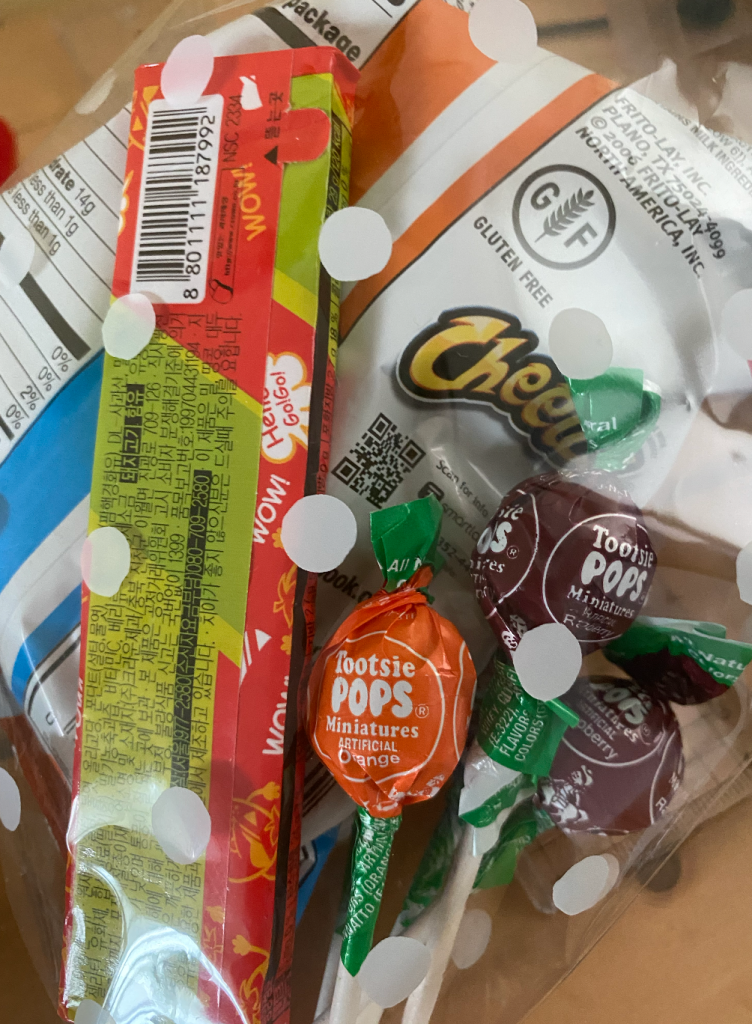 This was the goody bag we gave out as participation prizes! It includes one bag of Cheetos, 5 tootsie pop lollipops, one ėė―ĪëŽė―Ī (sweet and sour fruit caramels), and one handwritten card!