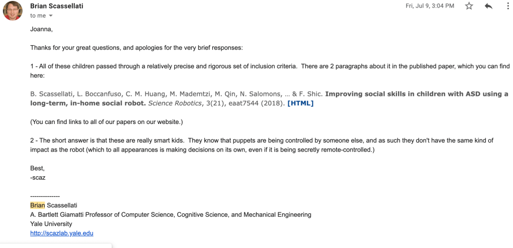 This is a bit late regarding the date of the reply, but I am still so excited to share Professor Brian Scassellati’s email response!