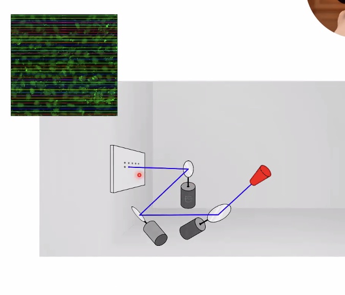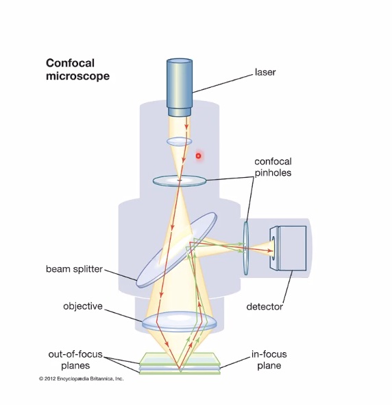 Excite the four floors, follow red area, go through objective through another pin hole (in focus so goes through pin hole through detector)