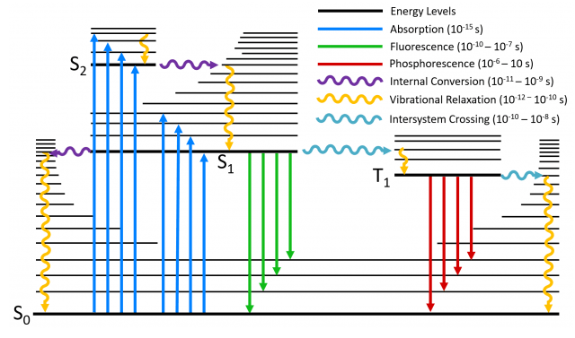 Before emission light hits, the electrons are in ground state. The light carries some energy, which pushes the electrons from ground to excited state. As the electron drops down to the bottom level of the excited state, it emits light (which is a different wavelength since each visible spectrum is a different color), lose energy to emit color, and returns to ground state.