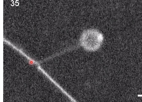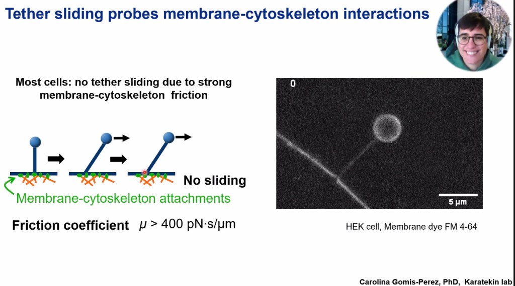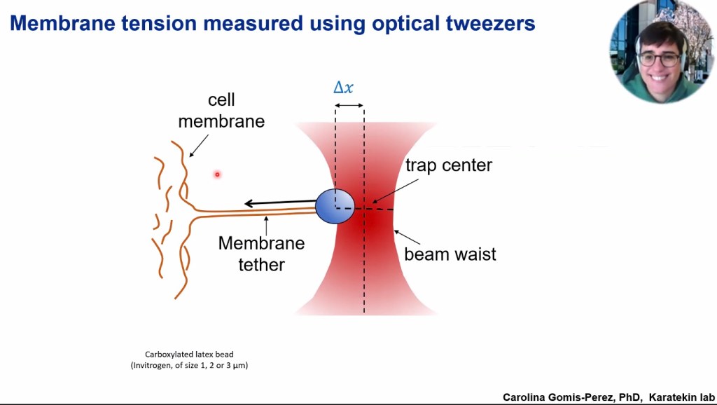 = Cell membrane sticks to it, briefly remove the bead —> creates a membrane tether (high urbiture of tether —> use it to see curvature preference of proteins)