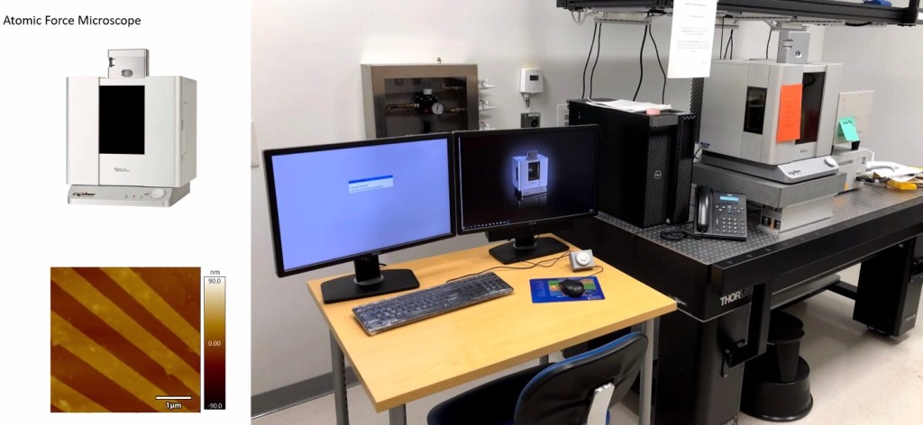 Process: AFM works by dragging tip across high profile of sample surface (measuring the changes in the height by pointing a laser at the tip and look at reflection on photodiode) and when tip moves —>> heigh changes —> reflection varies -> computer able to predict precise high profile