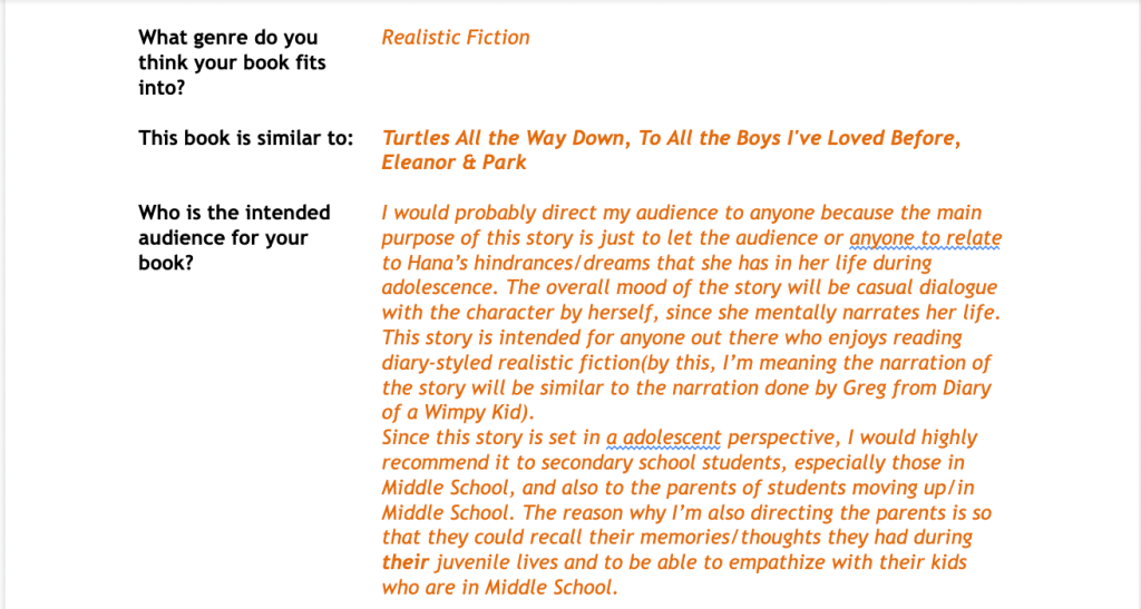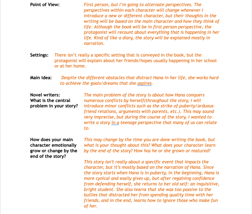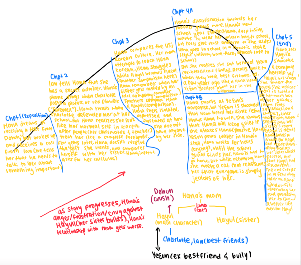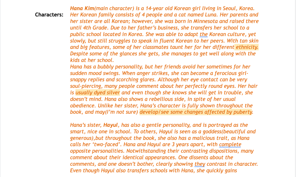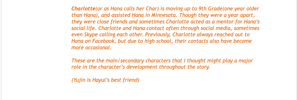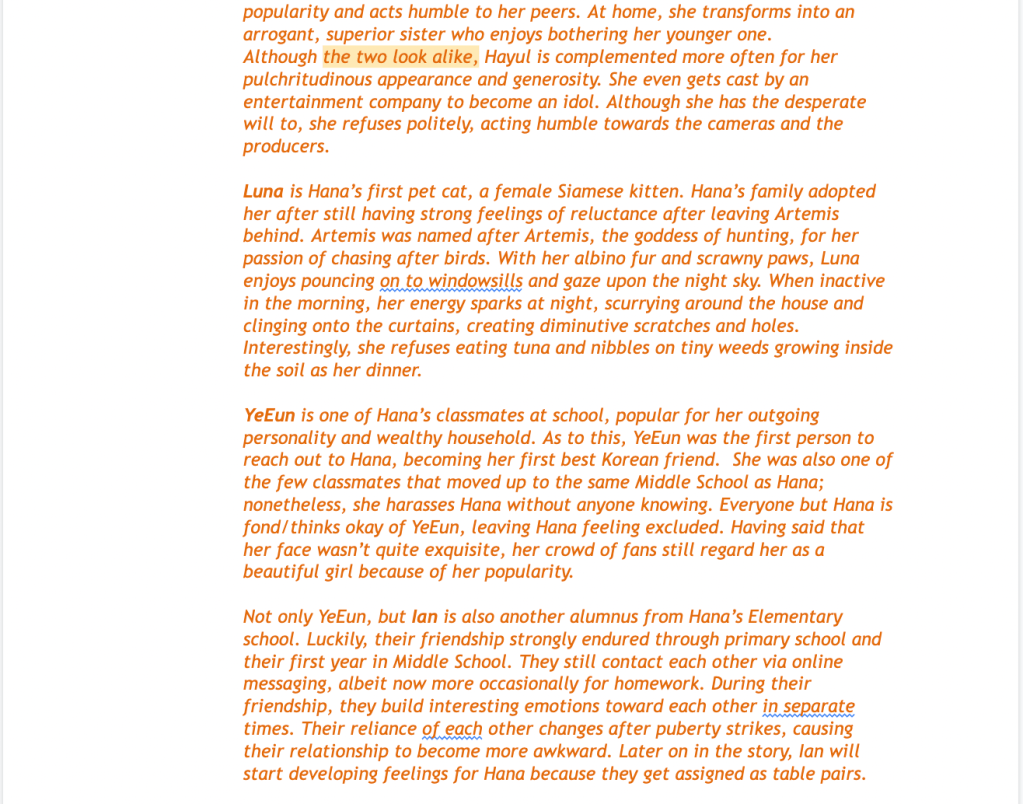 As my story progressed, the story became more focused on the bully that my main character used to be best friends with. It was supposed to be more focused on the main character’s life, but because I had to deepen the relationship between the main character, Hana, and her ex-bestfriend, now enemy, YeEun, I realized a few of my chapters were entirely focused on YeEun instead.