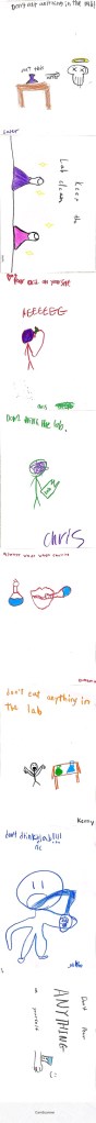 The overall atmosphere seemed to get a big tiring and down as the students began to finish their drawings, so we immediately moved onto a lab safety rule jeopardy. Students divided into their own teams of 4 and 3 students — Team Orange and Team Elephant.