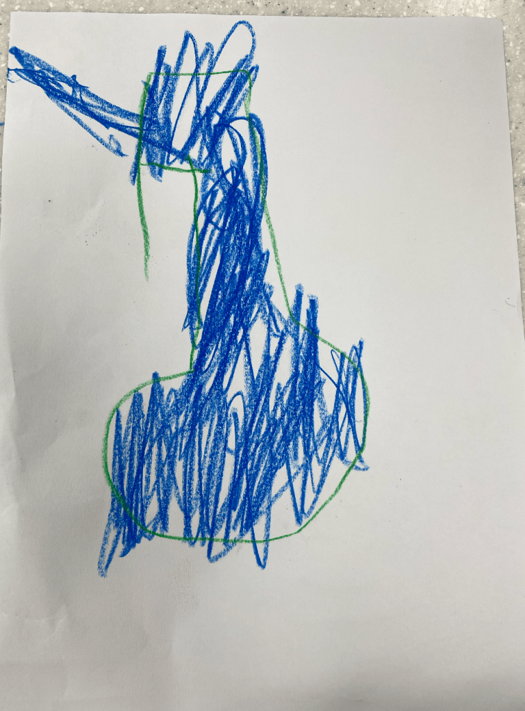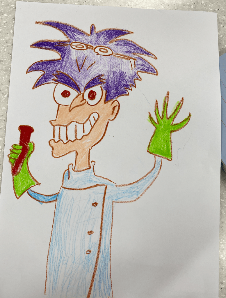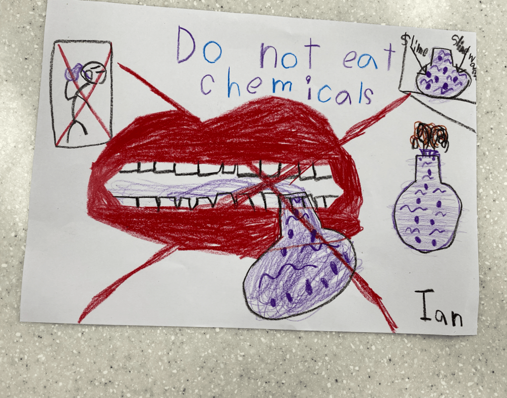 The other student continuously refused to draw his poster, so we tried to encourage him by singing a song about lab safety rules, and thankfully, he still drew a “lab instrument”, according to what he said. Honestly, it was difficult to understand what he was saying about this drawing, but I remember he labeled the blue solution as ‘dangerous water’? Maybe he meant it’s dangerous to ingest unknown chemicals in the laboratory.. Oh, also, I realized that for younger students, they’re especially more motivated and become more aware of the directions when you physically demonstrate the activity. (So I drew a mad scientist, and my friend drew a lab safety rule poster)