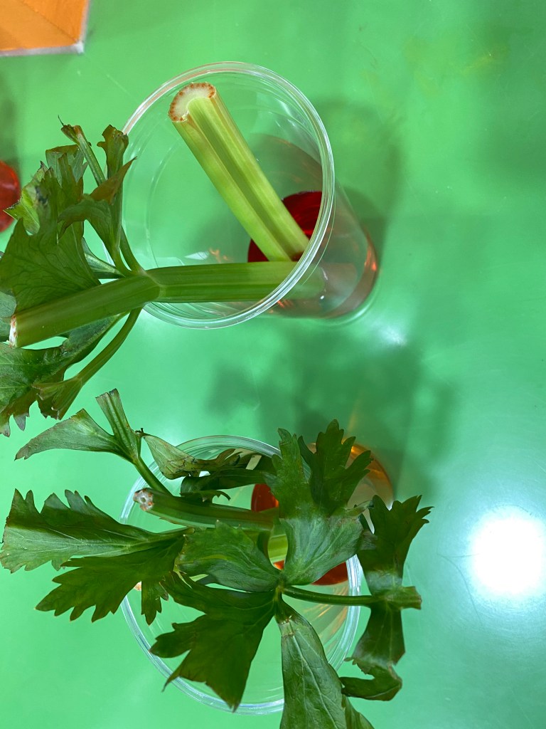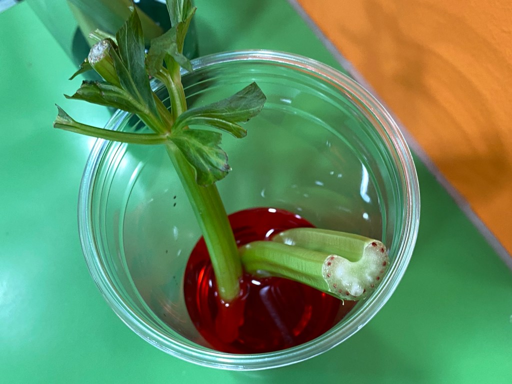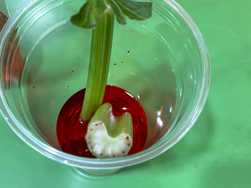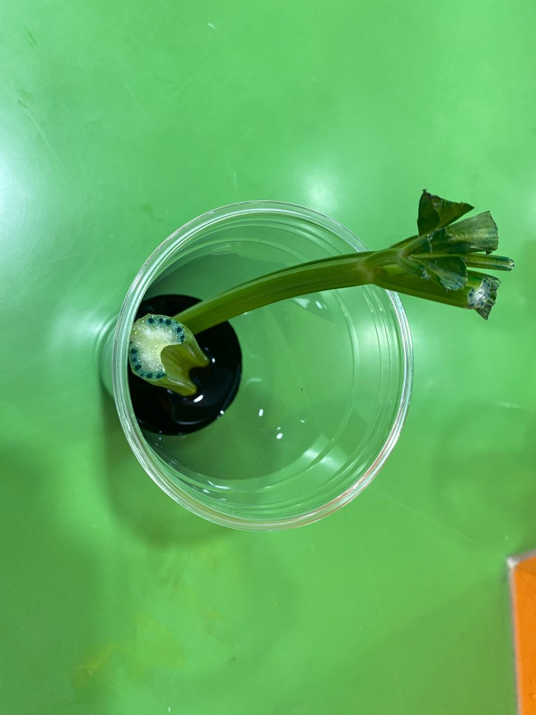 Today is the 24th of June, a Friday. Though Science class isn’t held on Friday, the lowerclass kids and I checked our celery growth and what amazing findings! The xylem of the celery were colored according to the color solution the celery was placed in, and the very ends of the leaves were tinted the color, which demonstrates that the water fully traveled through the celery! This experiment was a success ๐ (also, I never knew black food coloring was a thing until this class; the xylem interestingly turned bluish purple despite using black food coloring..)
